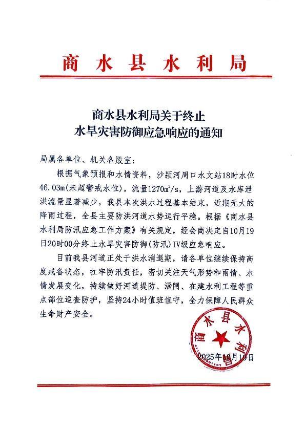 2025年商水县水利局关于终止水旱灾害防御(防汛)IV级应急响应的通知