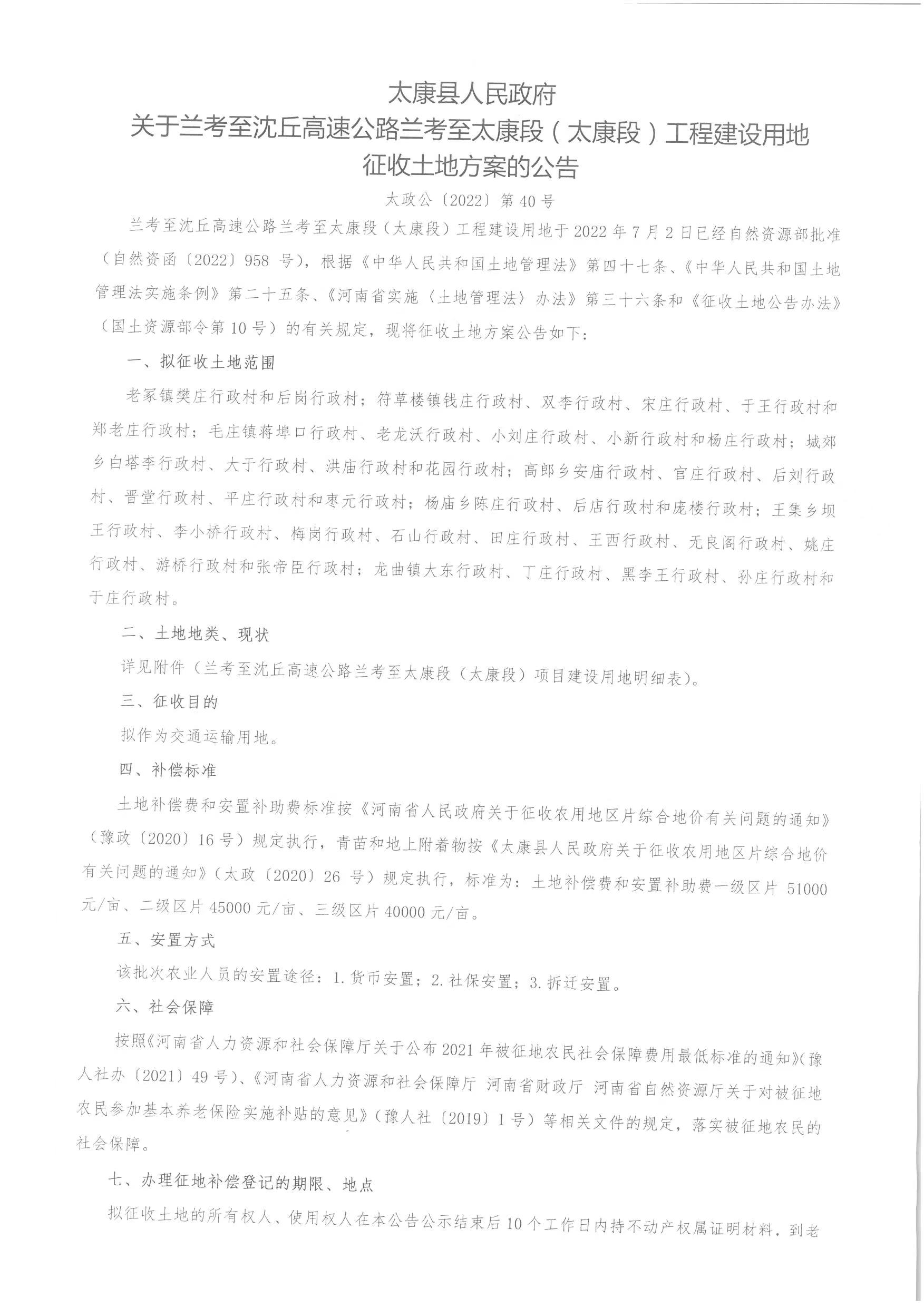 太康县人民政府关于兰考至沈丘高速公路兰考至太康段(太康段)工程建设用地征收土地方案的公告