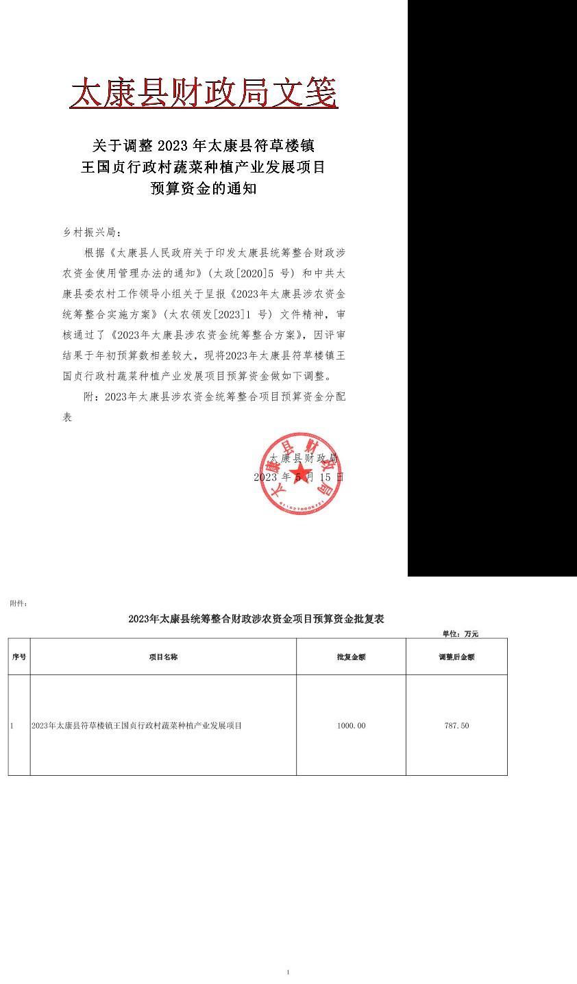 关于调整2023年太康县符草楼镇王国贞行政村蔬菜种植产业发展项目预算资金的通知