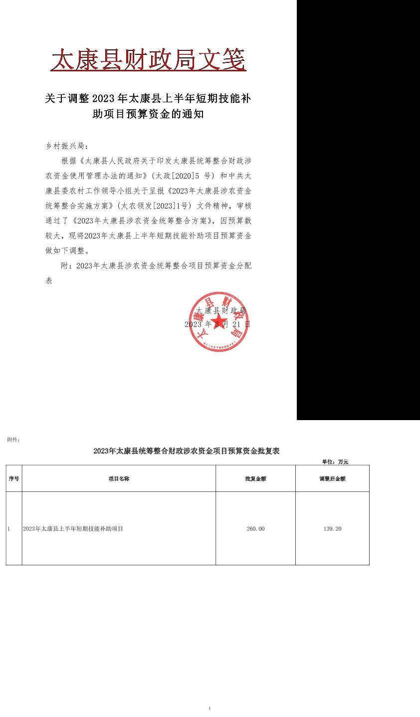关于调整2023年太康县上半年短期技能补助项目预算资金的通知