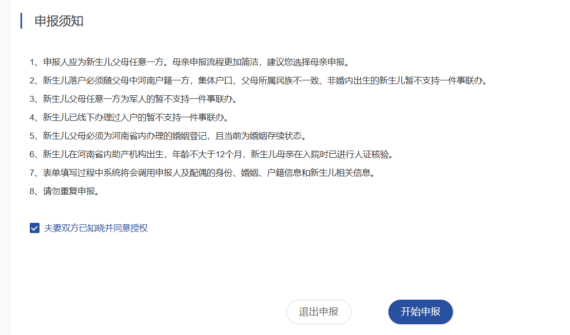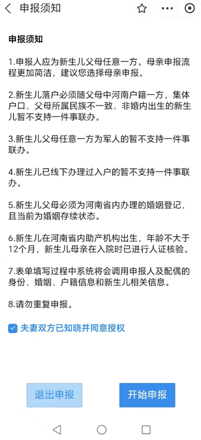 1.新生儿父母任意一方通过豫事办App或支付宝小程序登录账号,点击新生儿出生“一件事”,选择办理地区,阅读申报须知,表单填写过程中系统将会调用申报人及其配偶的身份、婚姻、户籍信息和新生儿的相关信息。同意授权后勾选夫妻双方已知晓并同意授权。点击“开始申报”,进行下一步。
