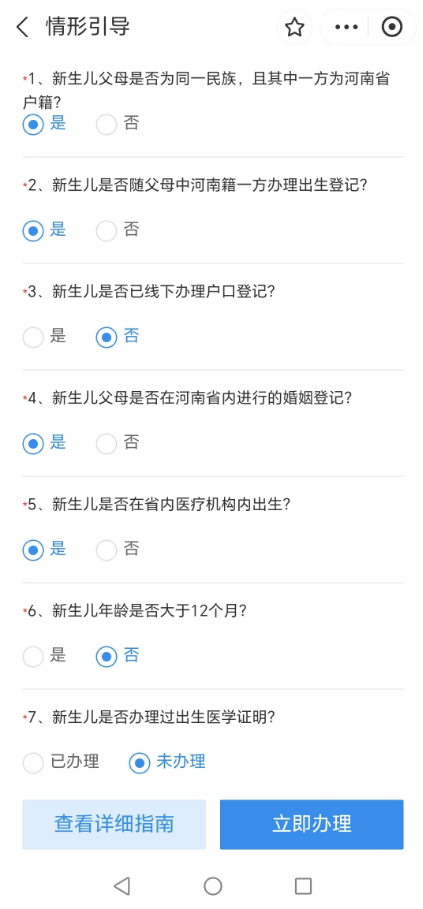 2.新生儿出生“一件事”提供引导式申报,请根据实际情况依次回答问题,引导完成后,点击“立即办理”,进行下一步。