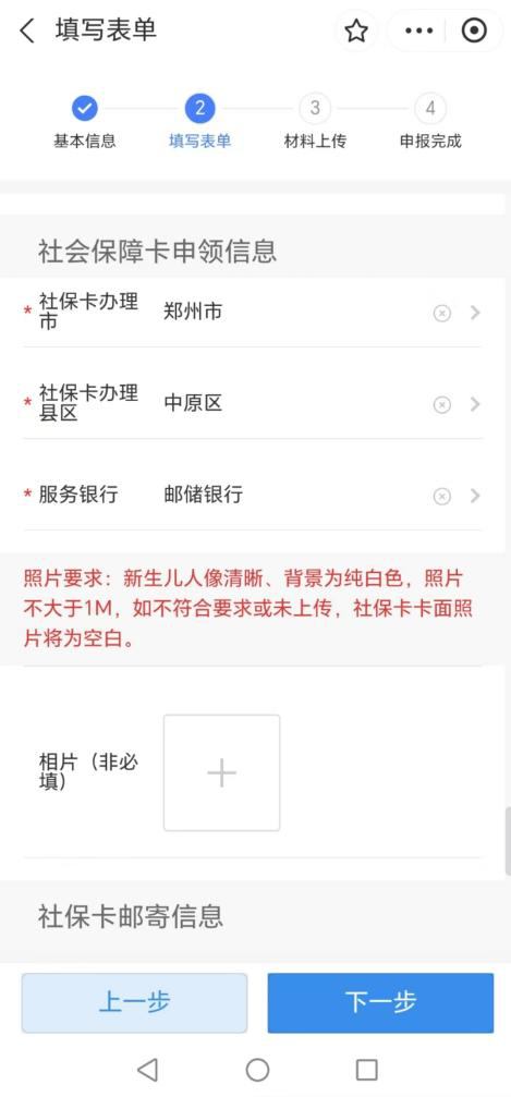 选择社保卡办理市、县和服务银行。新生儿照片可选择上传也可以选择不上传,若不上传照片或上传的照片不合格,新生儿社保卡照片处将会是空白。