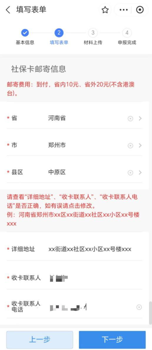 选择社保卡邮寄的省、市、县,系统将预填收卡地址,收卡人姓名和电话,如有误可点击进行修改。