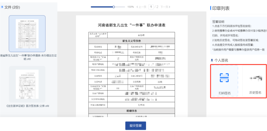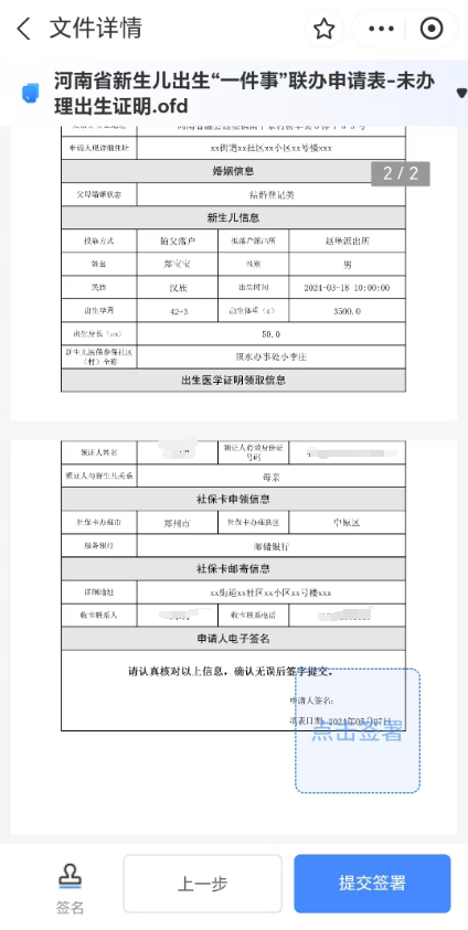 6、表单填写完成后,点击“下一步”,系统将自动生成联办申请表和《医学出生证明》首次签发登记表,申请人认真核对信息,确认无误后进行电子签名,签署成功后完成申报。