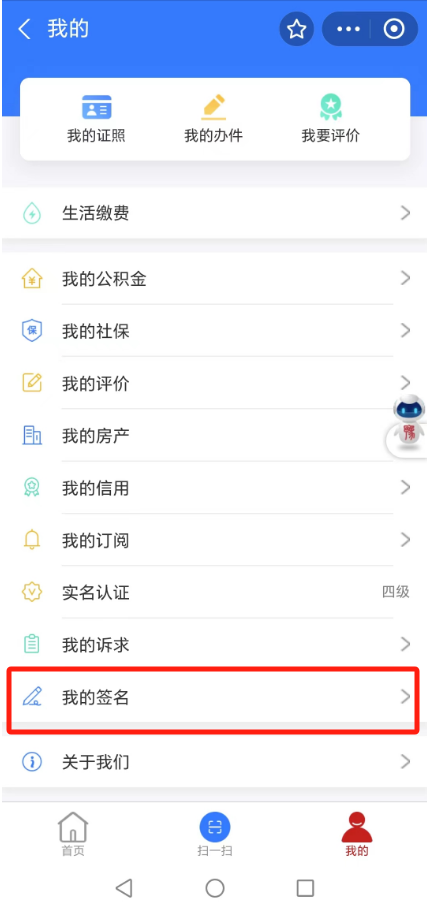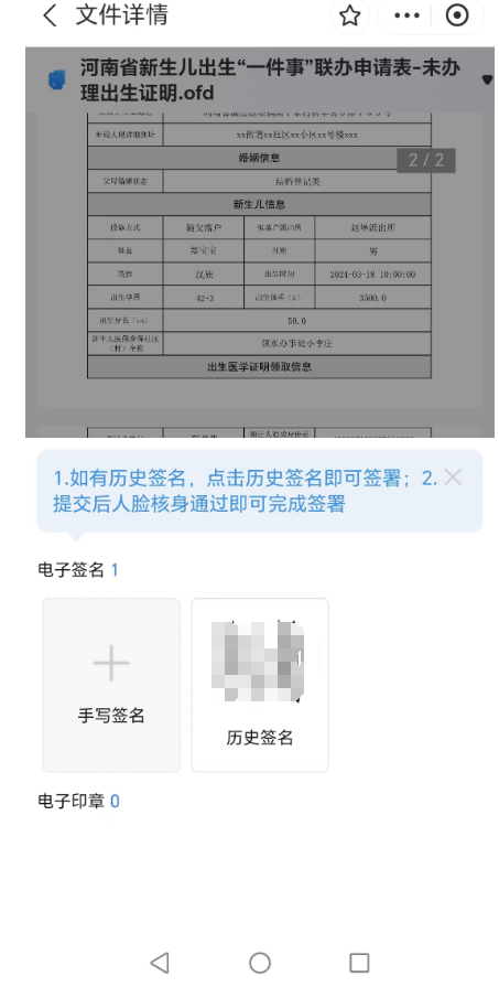 12、申请人申请完成后,申请人的配偶于一个自然日内登录“豫事办”App或支付宝小程序,在“我的-我的签名”待签署页面点击“电子签名”,对《医学出生证明》首次签发登记表进行电子签名(签名方式与申请人签名方式相同)。