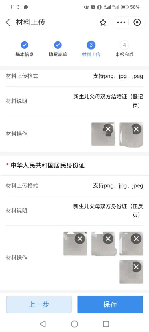 10、表单填写完成后,进入材料上传页面,分别上传新生儿父母双方结婚证登记页和身份证正反页,可以通过手机直接拍照上传或上传已经保存好的图片。