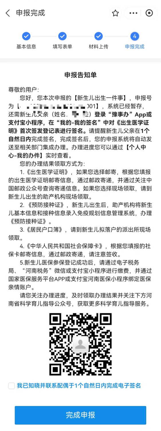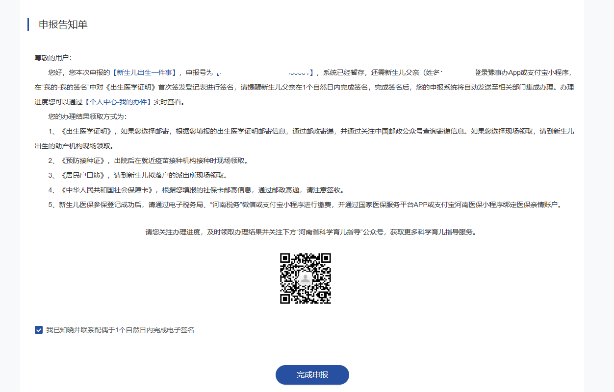 8.材料上传成功后,点击保存按钮,系统生成“申报告知单”,申请人的配偶需于一个自然日内登录“豫事办”App或支付宝小程序,在“我的-我的签名”中对《医学出生证明》首次签发登记表进行签名。签名完成后系统将自动发送至相关部门集成办理,您可以通过【个人中心-我的办件】实时查看办理进度。
