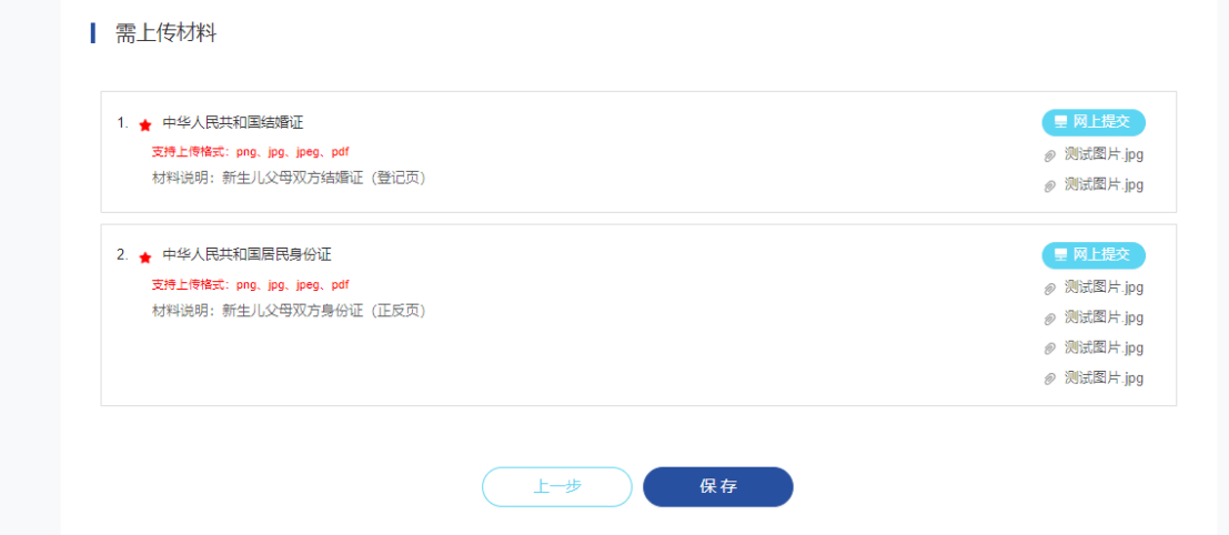 7.表单填写完成后,进入材料上传页面,分别上传新生儿父母双方结婚证登记页和身份证正反页。