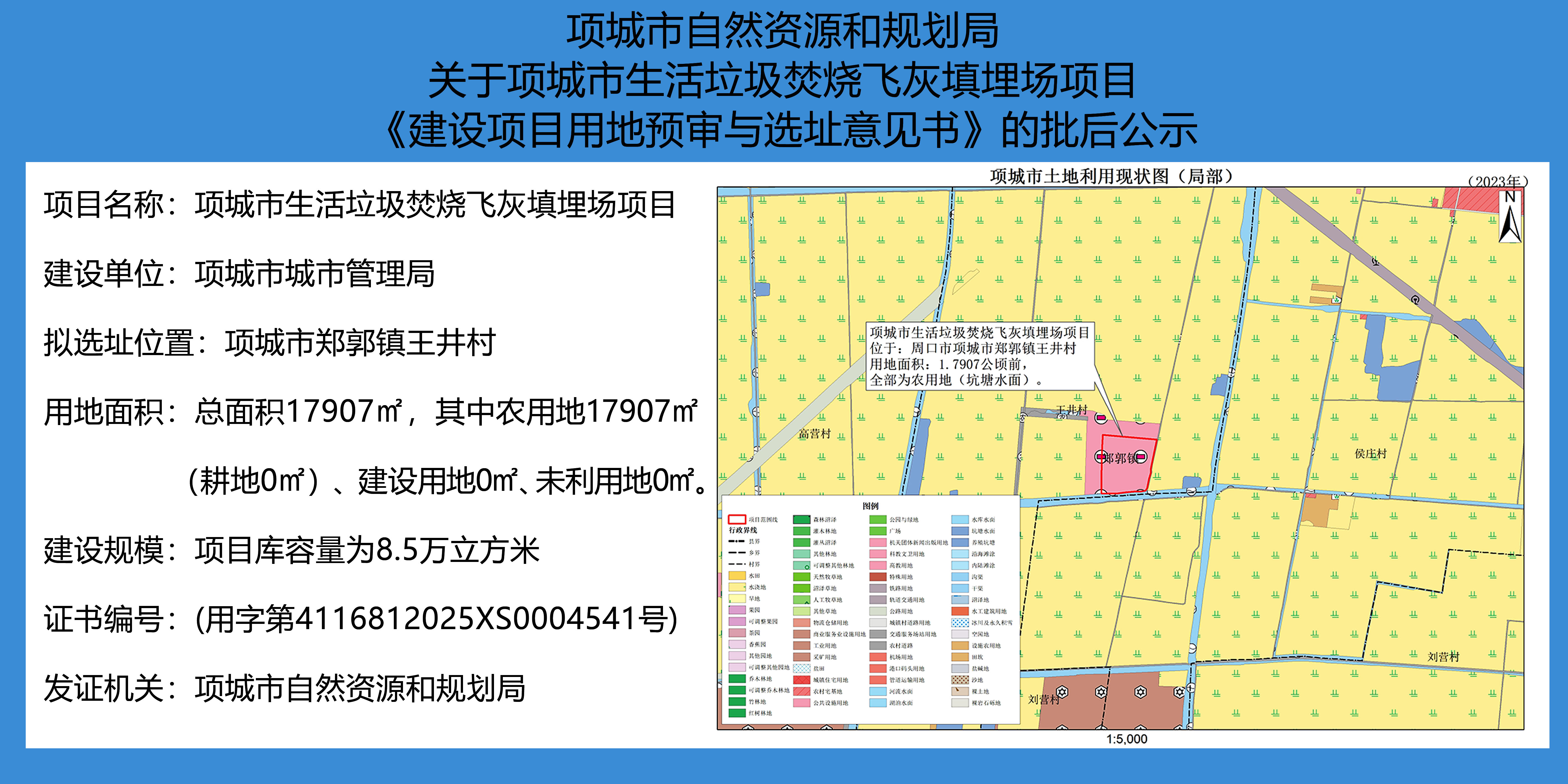 项城市生活垃圾焚烧飞灰填埋场项目《建设项目用地预审与选址意见书》的批后公示