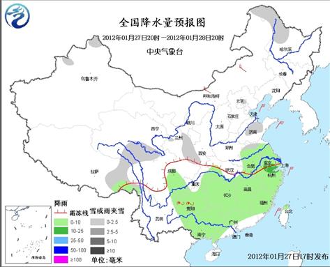 27日20时至28日20时,新疆西北部、西藏东部、青海东南部、西北地区东南部、黑龙江西北部、黄淮中部等地的部分地区有小雪或雨夹雪;西南地区东部、江淮、江南、华南大部等地的部分地区有小雨或阵雨,局部中雨,其中,贵州中西部局部有冻雨;内蒙古中东部有4~5级风。