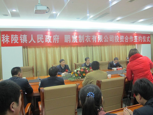 仪式上,秣陵镇政府负责人与鹏宸制衣有限公司负责人分别致辞,双方共同签署了合作协议。(邝越 胡晓光)