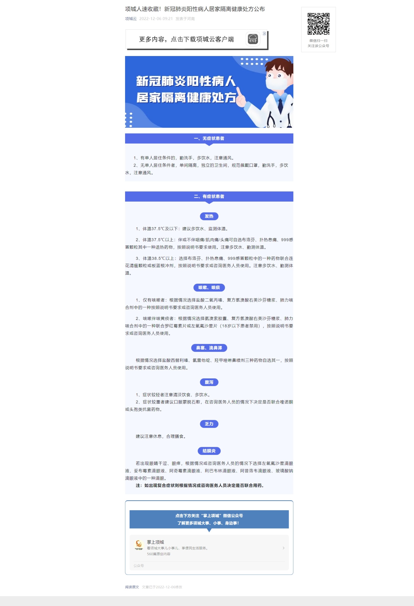 项城人速收藏!新冠肺炎阳性病人居家隔离健康处方公布