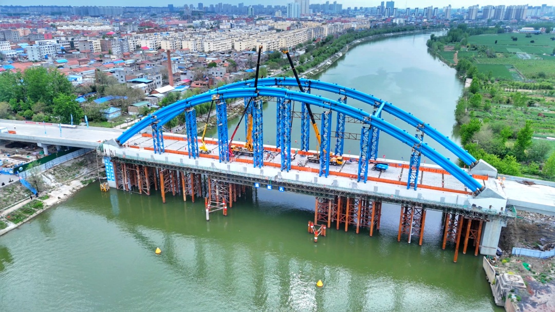 项城通济大道桥是省重点工程,也是沙颍河周口至省界航道提升项目的关键性节点,承载着提升通航能力、畅通区域路网的重要使命。4月14日,随着最后一节拱肋构件精准嵌入合龙口,通济大道桥主桥拱肋顺利完成合龙。这标志着该桥建设取得关键性进展,距离通车目标更近一步。记者 张志新 摄