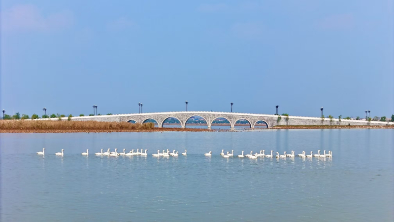 11月23日,一群白天鹅在淮阳龙湖水面自由游弋。由于龙湖生态环境持续向好,每年春、冬候鸟迁徙季节,都有白天鹅等候鸟陆续飞来,在这里小憩。记者杜欣摄