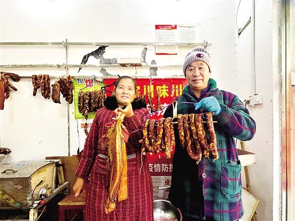 邱宗鑫和妻子展示他们制作的香肠和腊肉。