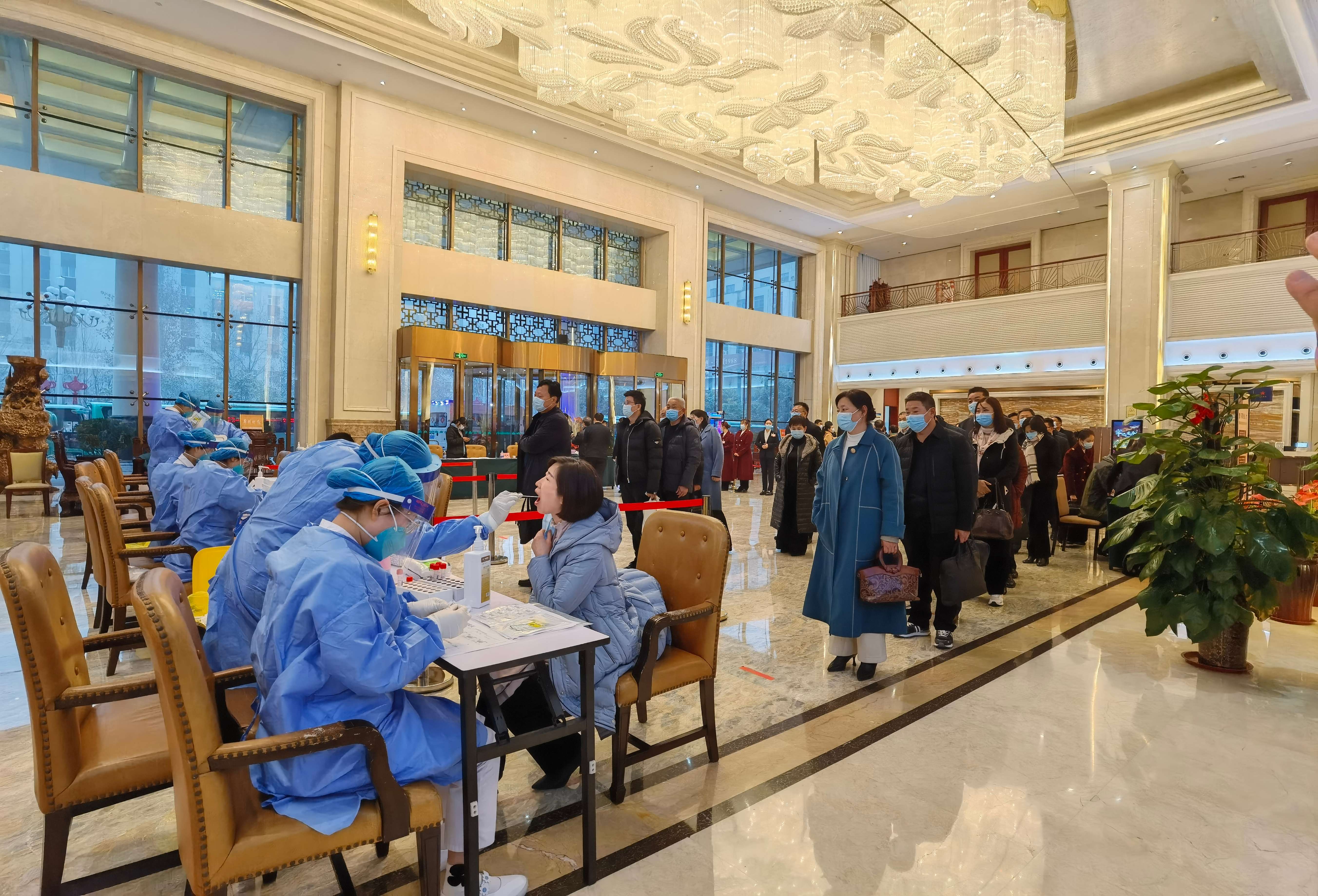在周口代表团入住地紫荆山宾馆,大会组委会要求与会人大代表在出发地和入住地分别进行核酸检测,入住地两次检测结果均呈阴性后方可参加会议。记者 王映 摄