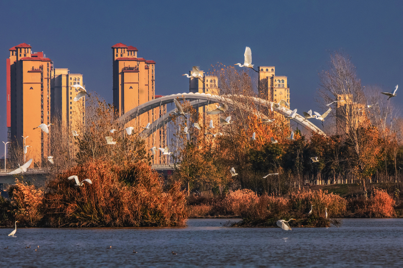 白鹭在中原路大桥周边翩翩起舞。(孙红光 摄)